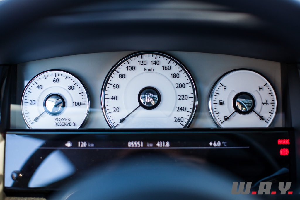 Le galbe et les rondeurs du véhicule ne peuvent cacher des dimensions hors normes dans une industrie automobile dominée par des voitures au gabarit contenu. Jugez plutôt : 5.57 mètres de long pour une largeur de 1.95 mètre sur une hauteur de 1.55 mètre. C’est 17 centimètres plus long que la Ghost standard qui – à mon avis – ne manquait pourtant pas de place à l’arrière. De plus, la robe deux coloris accentue encore la longueur avec ce capot, toit et coffre en Cassiopeia Silver. Le contraste avec le Midnight Sapphire est saisissant.
