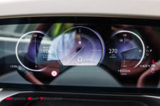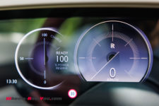 Pour ce qui est de l’instrumentation derrière le volant, c’est encore plus sobre avec uniquement trois cadrans qui s’affichent sur un écran haute définition : à gauche une première jauge qui regroupe la consommation et la recharge, au centre la vitesse et à droite l’autonomie. Trois petites zones de texte viennent agrémenter tout ça avec à gauche l’heure et à droite la température ainsi que la position de la transmission (P, R, N et D).