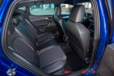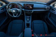 Les sièges sont en grande partie en tissu, avec un peu de cuir et la même surpiqûre rouge que sur le volant. Autant l’assise que le dossier ne sont pas très profonds, mais le maintient latéral est très satisfaisant. L’empattement de la Leon a été allongé de 50 mm qui profitent intégralement aux places arrière. Ainsi, un adulte peut confortablement voyager à l’arrière. Seul le volume du coffre sera limite, avec 380 litres ce sera un défi de partir en vacances à quatre.