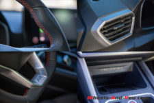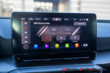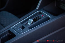 Si tout a migré dans l’écran, qu’est-ce que trouve sur le tunnel central ? Pas grand chose, un bouton de démarrage, un tout petit sélecteur de vitesse DSG très agréable à manipuler et trois boutons supplémentaires. Sous l’écran il y a l’emplacement à induction pour smartphone et deux prises USB-C, et c’est tout. Donc Seat aurait pu faire quelque chose de plus aérien, avec quelque chose de suspendu et l’espace aux jambes gauche/droite qui communique, mais il a été décidé de rester dans du très classique.