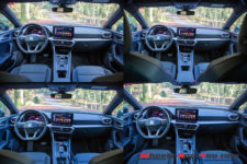 Si les carrosseries Seat transmettent une émotion, l’intérieur est plus proche du sérieux très germanique. Sur le tiers inférieur des habillages, ce sera plastiques durs avec un insert cuir dans le panneau et accoudoir de porte. Le tactile fait une apparition en force, avec les plafonniers avant et arrière, les boutons d’éclairage à gauche du volant, la ligne qui supporte l’écran et justement ce large écran optionnel de 10” posé là au sommet sans s’intégrer.