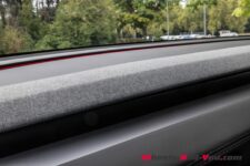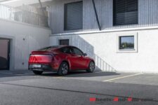 A l’avant, les phares sont maintenant en deux parties : les feux de jour sont reliés par la bande lumineuse traversante alors que les feux de route sont désormais installés dans le bouclier avant. Celui-ci couvre la majeure partie de la surface frontale ; seule une petite entrée d’air, sous le pare-chocs, est présente pour refroidir la voiture.