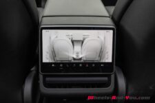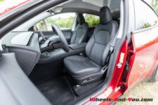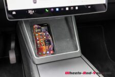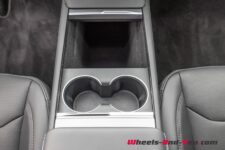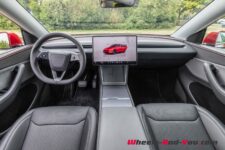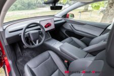 L’intérieur Tesla est conservé. On est ici dans le dépouillement poussé à son paroxysme. Un grand écran de 15.4 pouces à droite du volant, avec juste au-dessous une grande surface de recharge sans fil pour 2 smartphones et des couvercles masquant un vide-poches et des porte-gobelets. On trouve également un deuxième vide-poches sous l’accoudoir central. La sellerie est une combinaison de cuir végane et de tissus.