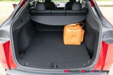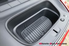La voiture a deux coffres, un sous le capot avant et le principal à l’arrière. Les 116 litres proposés à l’avant sont étanches, avec même un bouchon de vidange ; on peut donc le remplir de glaçons et de cannettes pour une sortie pique-nique ! A l’arrière, le hayon s’ouvre sur un volume de 822 litres (volume sans tablette cache-bagage comme toujours chez Tesla). La tablette cache-bagages est sensée pouvoir être repoussée vers l’avant pour la faire coulisser contre le dossier des sièges mais cela ne fonctionne pas. Il est cependant facile de trouver des alternatives sur Internet pour la remplacer.