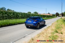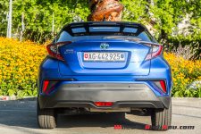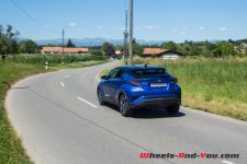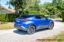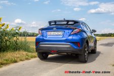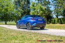 Le design des feux arrière est des plus exotiques : les imposants optiques structurent le dessin et amorcent le prolongement qui forme le « winglet ». Le bouclier y est imposant. L’aileron, inscrit dans la continuité du pavillon, ajoute la dernière touche de singularité au design innovant du C-HR.