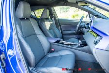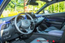 Le tableau s’assombrit quand arrive la montagne. Si la C-HR aborde les premiers virages avec un bon entrain, à mesure que les ressources de la batterie diminuent, le moteur thermique est de plus en plus sollicité, pour finalement devenir l’unique source de puissance, à mi-chemin d’une escalade d’un col de 7 km, sur une pente de 6% en moyenne. Je peux prendre les virages à bonne allure, le roulis étant bien amorti et le châssis faisant preuve d’une belle rigidité, et en ressortir avec un dynamisme correct. Mais je plafonne ensuite à 55-60 km/h, les piles étant K.O et le ratio de la transmission à variation continue étant au plus haut. Une fois le sommet atteint, je peux amorcer la descente. Je constate sans délai que le C-HR offre une tenue de route vraiment bonne. Et quand je la mets à l’épreuve dans des virages serrés, l’électronique joue son rôle à plein. En cas de manœuvre un trop volontaire, le système freine intelligemment et ramène le véhicule sur la bonne ligne.