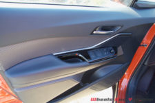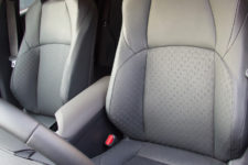 Ce n’est pas à l’intérieur de l’habitacle que Toyota va nous surprendre. La planche de bord reste identique à l’ancienne version, avec tout de même un revêtement de meilleure qualité. J’aime beaucoup les contre-portes au look et formes de losange modernes. On retrouve d’ailleurs ces formes embouties dans le ciel de toit à l’avant et dans le cuir aéré de l’assise et bas du dossier des sièges (sellerie appelée T-Line).