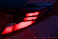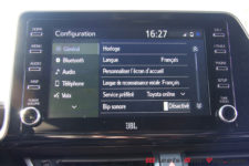 Comme indiqué au préalable, pour notre essai, nous bénéficions de la finition haut de gamme avec, de série, la sellerie cuir, le siège conducteur électrique, l’allumage automatique des phares, l’avertisseur d’angles morts et de circulation arrière, le limiteur de vitesse, le système audio JBL à 9 haut-parleurs, une station de recharge sans fil pour les mobiles, la climatisation automatique bi-zone, les vitres arrière sur-teintées, un radar de stationnement avant et arrière, l’accès sans clé, les rétroviseurs rabattables électriquement, le démarrage sans clé, le Toyota Safety Sense incluant le système de pré-collision, l’alerte de franchissement de ligne, la reconnaissance des panneaux de signalisation et enfin du régulateur de vitesse adaptatif. Au moins, avec cette déclinaison, on ne perd pas de temps pour le choix des options, tout y est.