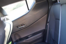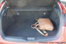 On accède aux places arrière en actionnant une poignée de porte située bizarrement en haut dans l’angle de la portière. Les places arrière sont clairement destinées pour accueillir des enfants. Deux adultes tiendront mais se sentiront vite confinés, pour utiliser un terme en vogue actuellement. Ce C-HR est plus le SUV d’un couple avec un enfant en bas âge. Cela se confirme avec le volume du coffre dont la capacité de 377 litres est correcte mais pas énorme si l’on compare aux autres véhicules de même dimension. A titre de parallèle, un Renault Captur offre un volume de coffre de 540 litres.