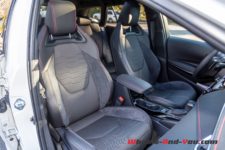 Si la carrosserie joue dans la section originalité, l’intérieur évolue dans la ligue classicisme. La mise est clairement sur la sobriété, quitte à largement faire dans le monochrome noir. Les surpiqûres rouges sur les sièges, la planche de bord et les contre-portes apportent toutefois une petite touche « sport » tandis que l’alliage tissu/cuir des fauteuils permet de rehausser l’aspect qualitatif de la finition.