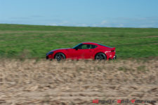 La ligne générale est tendue et musclée. J’aurais tant aimé un arrière sans béquet, plus arrondi comme le fut celui de la 2000 GT. Mais il ne faut pas rêver. Parfois je me verrais bien designer et carrossier… L’avant est assez tendu dans les lignes surtout dans sa partie basse. Cette Supra a le regard qui tue et peut-être un peu trop. Là encore, deux phares ronds façon « 2000 GT » auraient donné un look d’enfer et on aurait vite oublié la BMW… Mais voilà, c’est ainsi il faut vivre avec son époque. Dans cette livrée « Prominence Red » elle attire la sympathie. Cela faisait longtemps même qu’une voiture ne m’avait autant apporté de bienveillance et de pouces levés.