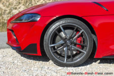 Les jantes de 19 pouces en cinq branches doubles bi-ton et fines laissent entrevoir les gros disques ventilés et vont bien avec le style de la voiture. La Supra reçoit de série des suspensions adaptatives avec deux types de réglage : Normal et Sport. Elle est chaussée de pneus Michelin Pilot Super Sport, plus larges à l’arrière qu’à l’avant (275/35 contre 255/35) et d’un système de freinage Brembo avec des étriers à quatre pistons. Je confirme, ça freine !