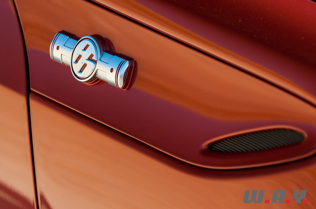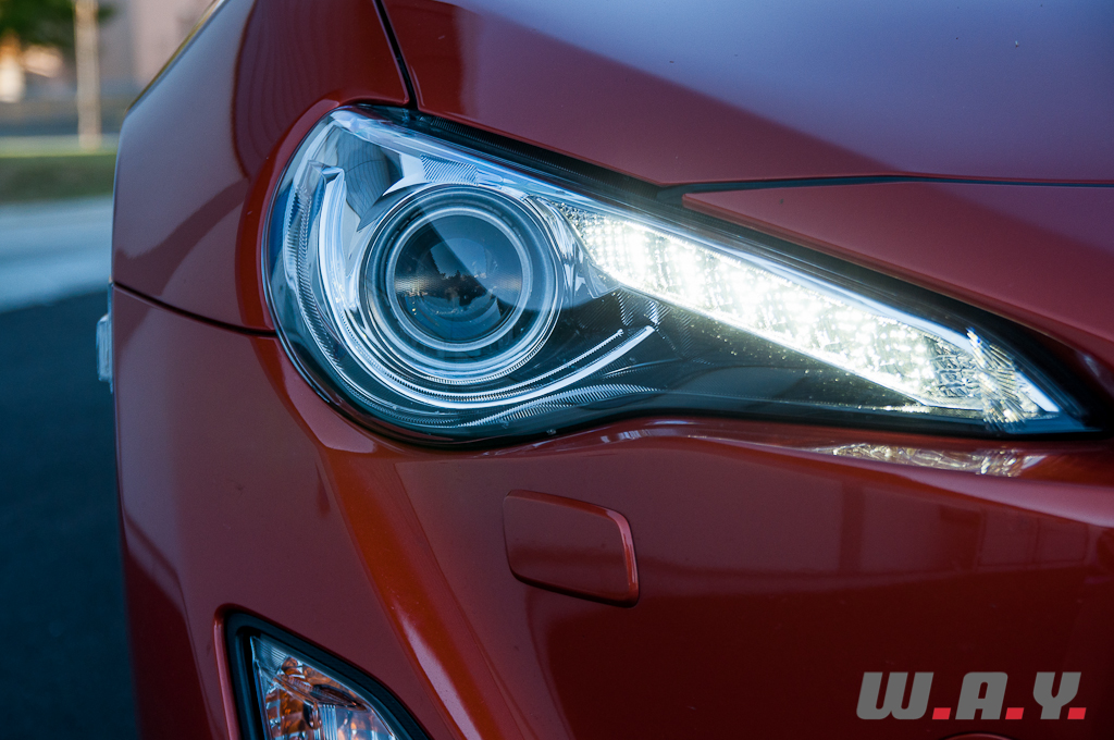 Très fluide, l’ensemble est très plaisant à regarder, un joli coupé deux portes avec un toit profilé du plus bel effet. A l’inverse de la tendance actuelle qui pousse les constructeurs à monter des jantes et des pneus démesurés, cette Toyota GT 86 se voit équipée d’une monte raisonnable en 215/45 R17 qui aurait mérité d’être un peu plus audacieuse. Je noterai encore quelques petits détails sympathiques comme le feu brouillard arrière en forme de triangle qui s’inspire de la Formule 1 et les logos situés sur les flancs de la voiture dont le dessin intègre deux pistons opposés.
