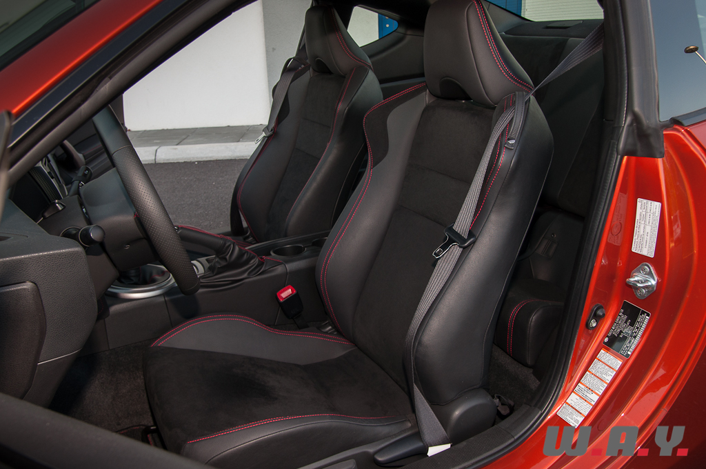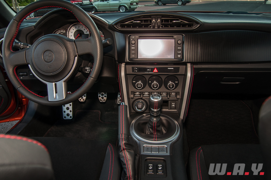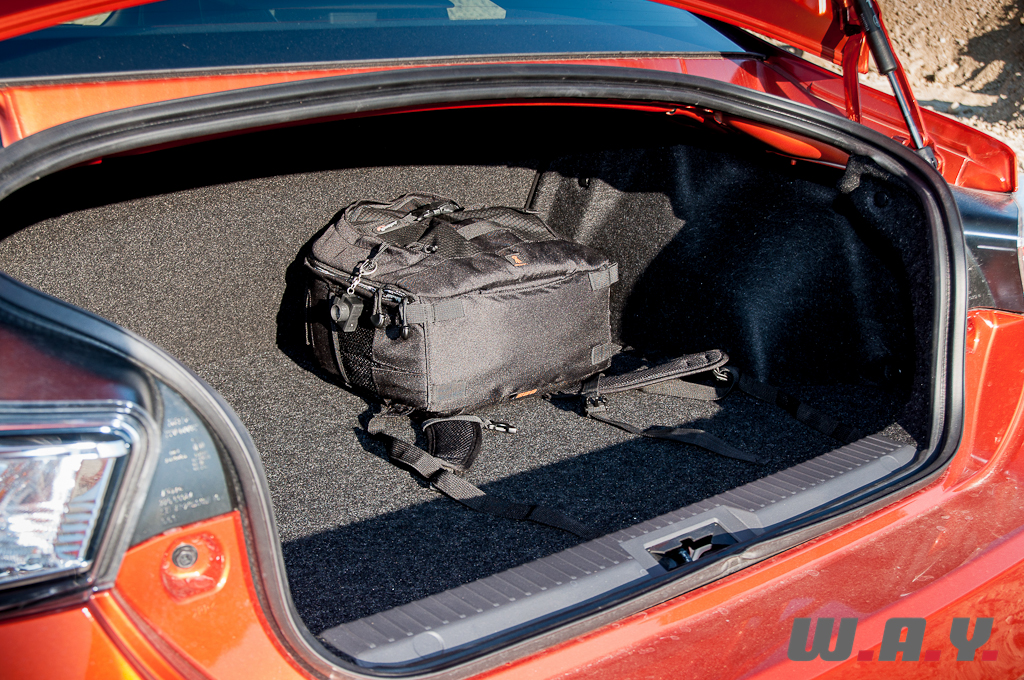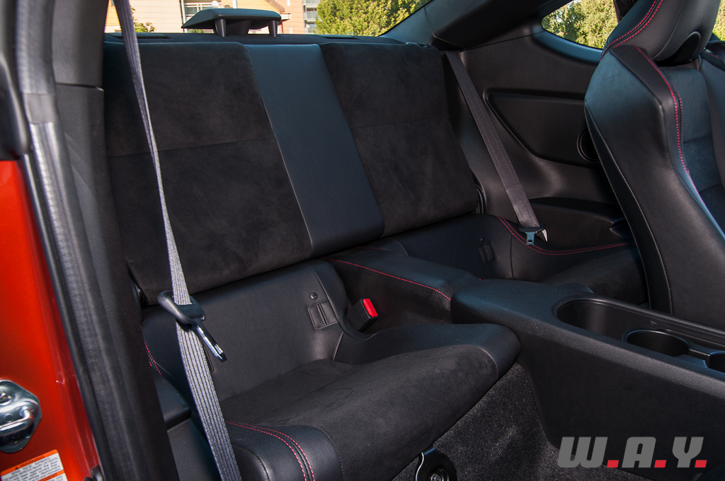 Si la Toyota GT86 s’affiche comme une voiture jeune et dans l’air du temps, j’ai trouvé l’intérieur un peu trop standard. A l’exception de quelques touches de couleur rouge, l’ensemble est plutôt banal et austère, donnant l’impression d’être dans une japonaise du début des années 2000. Nous sommes habitués par la plupart des constructeurs nippons à des intérieurs simples, composés de différents plastiques et cette GT86 nous le prouve une nouvelle fois avec cependant une qualité relativement bonne. Pour une voiture de cet acabit, j’aurai espéré plus d’extravagance. Hormis cela, je suis très bien installé au poste de pilotage, les sièges apportent un excellent maintien, le volant tombe parfaitement dans mes mains, tout semble réuni pour m’apporter beaucoup de plaisir au volant. Même constat pour le passager. Par contre pour les places arrière, à l’exception d’y installer des enfants – j’ai bien dis des enfants, pas des adolescents – il faudra être drôlement souple et petit pour en profiter. A deux, pas de souci, la GT86 est parfaitement viable avec tout le confort nécessaire et un coffre généreux de 243 litres. Par contre, autant à trois vous pouvez éventuellement envisager de rejoindre le resto du village suivant, qu’à quatre il est préférable de ne pas y penser ou alors vraiment pour dépanner.