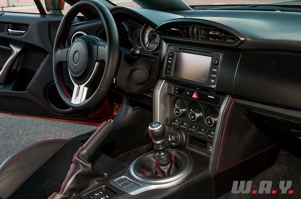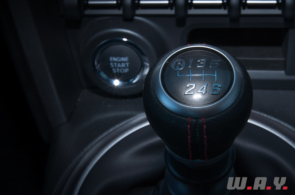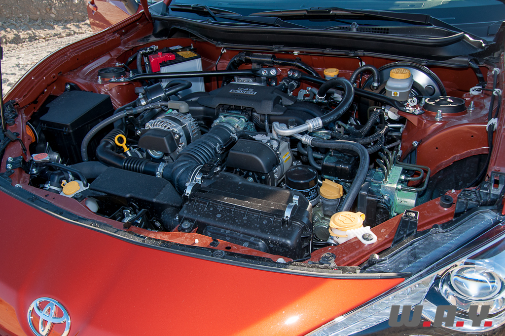 Le partenariat avec Subaru s’affiche clairement sous le capot avec la présence d’un quatre cylindres à plat, un boxer à la sonorité rauque bien connue des amateurs des modèles du constructeur aux six étoiles. La motorisation 2.0 développe 200 CV à 7’000 t/min pour un couple maximum de 205 Nm disponible à 6’400-6’600 t/min. Petit détail, le « 86 » du nom de la voiture, équivaut aussi à la mesure en millimètres de l’alésage des cylindres ainsi que de la course des pistons du moteur. Sur le papier les chiffres sont plutôt intéressants quand on sait que la Toyota pèse environ 1’300 kg en fonction de l’équipement. Mais on le verra plus en détail, il manque un petit plus pour rendre cette GT86 totalement irrésistible. Nous espérons d’ailleurs qu’une version compresseur ou turbo – je suis convaincu que Subaru déclinera la BRZ à la sauce STI – voit le jour prochainement et si ce n’est pas directement via Toyota, les préparateurs japonais s’en chargeront. Certes les montées en régime sont franches, le moteur semble plutôt rageur mais ça s’arrête là.