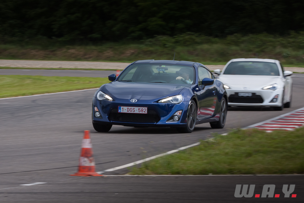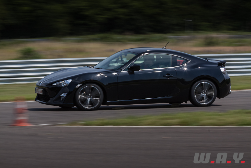 Si j’étais impatient d’amener cette Toyota sur « mes » routes c’est que j’avais déjà eu un avant-goût de son potentiel lors d’un premier contact quelques semaines auparavant sur le tracé de l’Anneau du Rhin en Alsace où nous avons pu repousser les limites de la GT86 dans un milieu dédié à cela, un circuit. Eh oui de nos jours plus moyen de faire des folies sur route ouverte, il est bien plus prudent d’aller exploiter nos jouets respectifs sur des terrains de jeu adéquats. J’ai tout d’abord commencé avec douceur, toutes les assistances à la conduite en place et j’ai découvert une voiture plaisante à conduire, rigolote, facile à prendre en main mais comme expliqué auparavant, un peu sous-motorisée – c’est la dernière fois que j’en parle – et pas si sensationnelle que ne le laisse suggérer sa ligne. Encore une fois, je suis convaincu que nous sommes mal habitués avec l’armada de chevaux qu’on peut retrouver sur la plus simple voiture de Monsieur ou Madame tout le monde. Au fur et à mesure des tours, j’ai déconnecté les différents garde-fous électroniques pour trouver une auto joueuse en mode VSC Sport, puis très très fun en débranchant la totale. Adeptes du drift, cette voiture est faite pour vous ! Un virage, un coup de volant et paf le train arrière se dérobe pour mon plus grand plaisir ! Après c’est surement aussi une question de technique, mais peut-être qu’avec un peu plus de chevaux et de couple (j’avais pourtant dis que j’en parlais plus) il serait plus facile de maintenir la glisse. Dans tous les cas, sans aller très vite et surtout sans prendre de risque, il est tout à fait possible de jouer avec cette GT86. Bravo Messieurs les ingénieurs, pour moi l’objectif est atteint, cette Toyota GT86 est vraiment une voiture ludique et très plaisante à conduire.