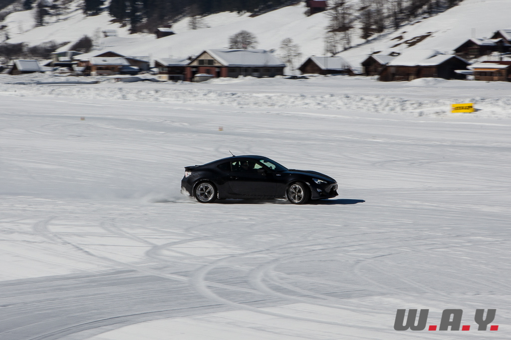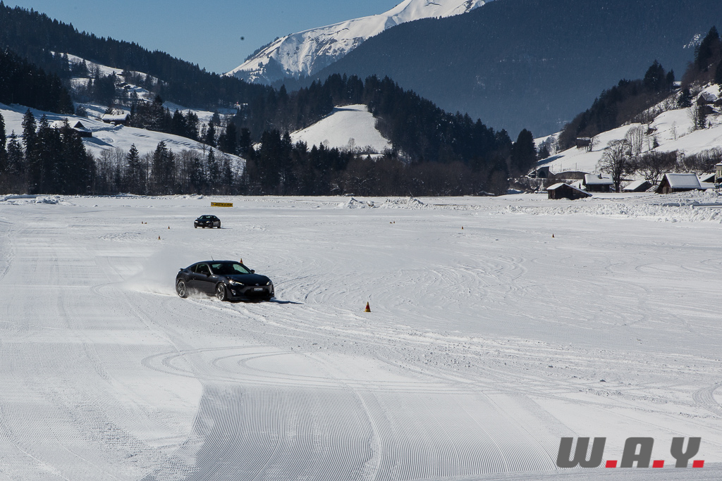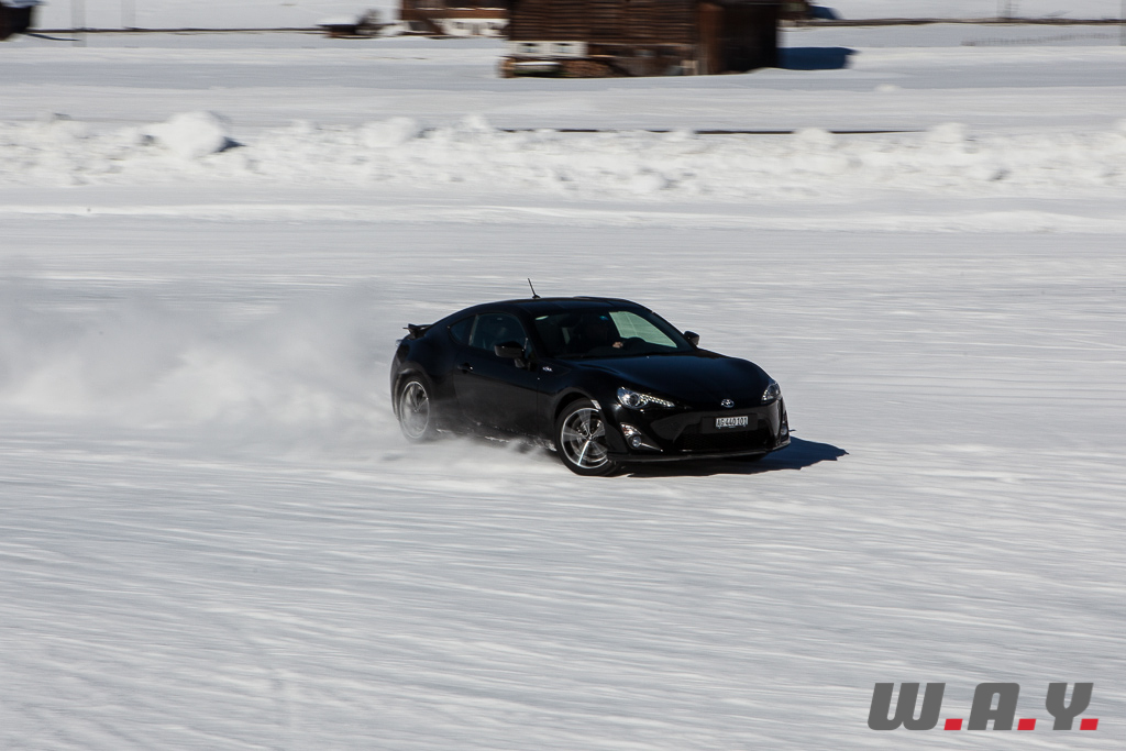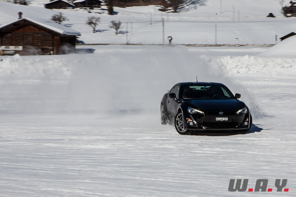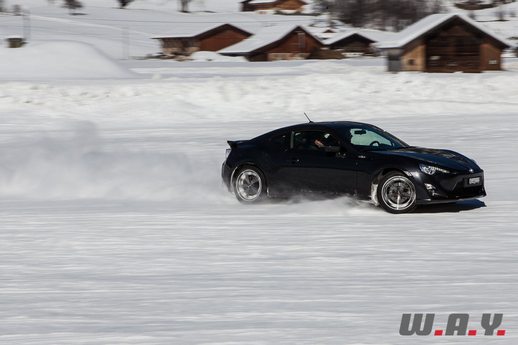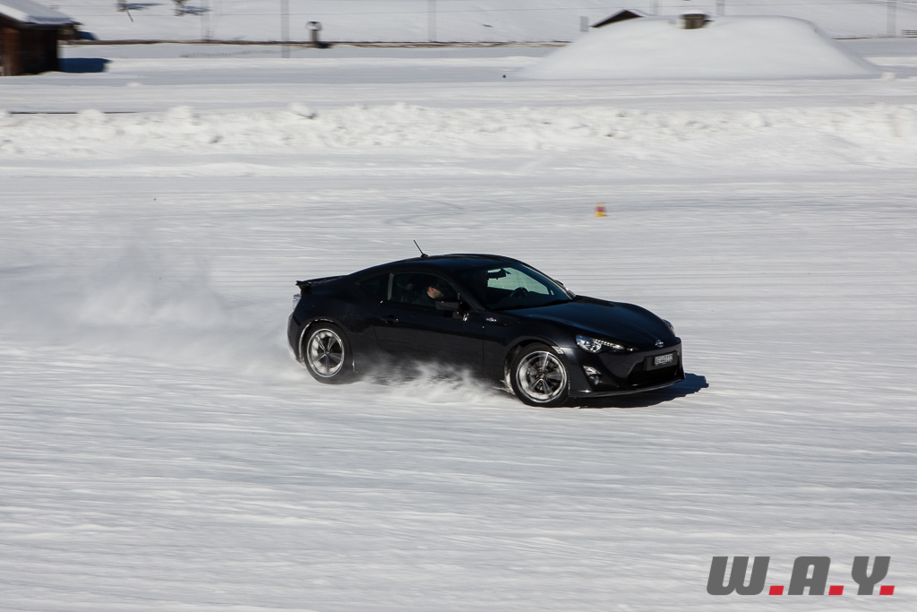 Bien entendu, je ne peux pas faire un compte rendu pour chaque véhicule essayé mais j’aimerais revenir sur une voiture que nous avons essayé il y a quelques mois : la Toyota GT86. Personnellement, c’était la première fois que je prenais place dans ce petit coupé et autant le dire tout de suite, j’ai adoré l’expérience car jusque là, le principal reproche qui était fait à cette propulsion était un manque de chevaux manifeste (200 CV). Sur la neige, rien de tel. Le poids contenu de 1’310 kg, la boîte précise, un empattement court de 2.57 m et une excellente position de conduite permettent de réellement s’amuser et d’apprécier pleinement cet excellent châssis.