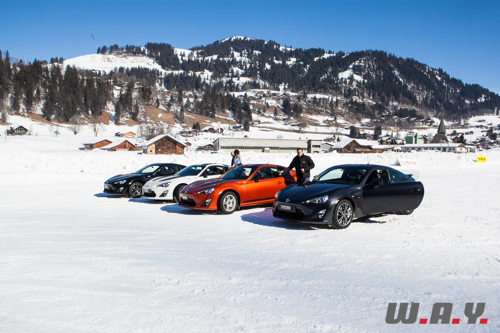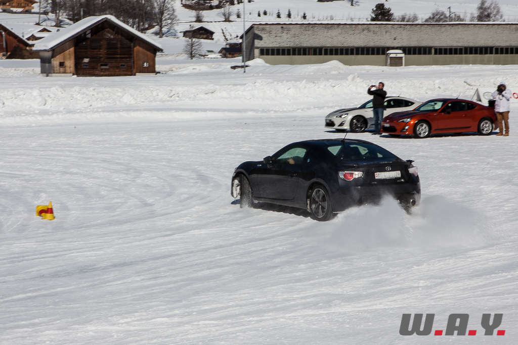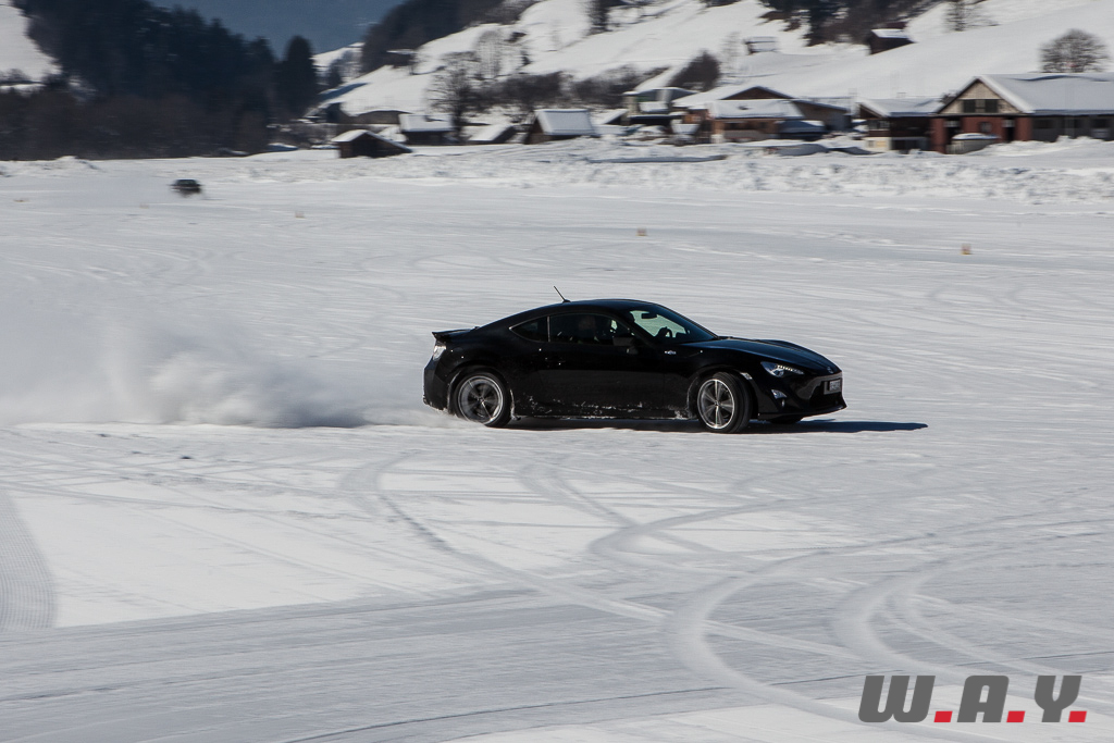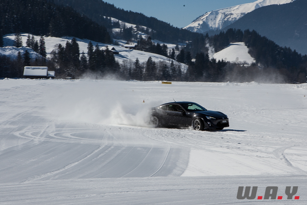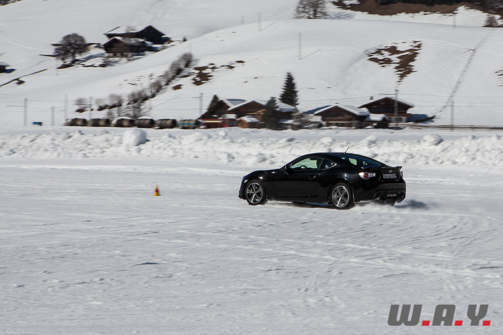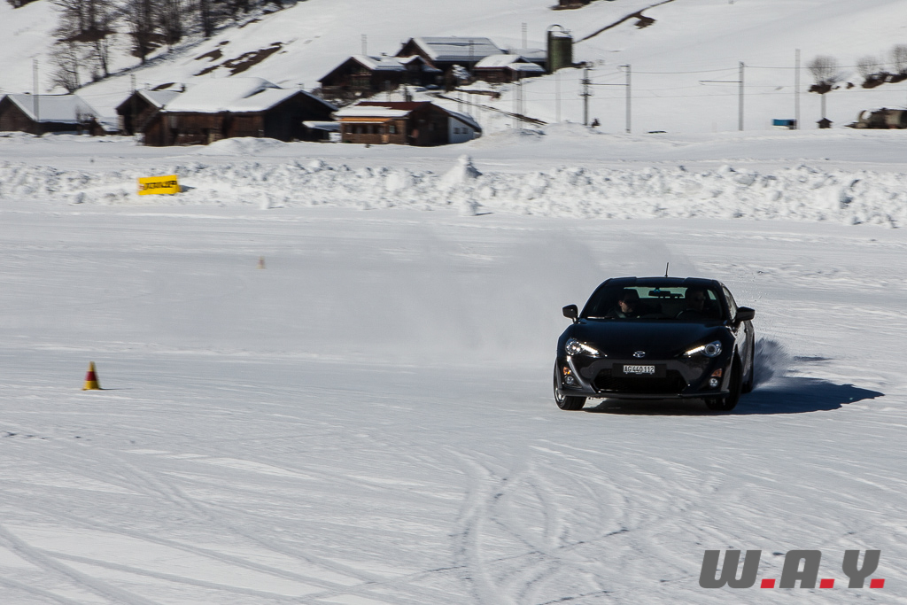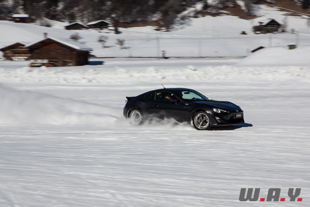 Bien entendu, je ne peux pas faire un compte rendu pour chaque véhicule essayé mais j’aimerais revenir sur une voiture que nous avons essayé il y a quelques mois : la Toyota GT86. Personnellement, c’était la première fois que je prenais place dans ce petit coupé et autant le dire tout de suite, j’ai adoré l’expérience car jusque là, le principal reproche qui était fait à cette propulsion était un manque de chevaux manifeste (200 CV). Sur la neige, rien de tel. Le poids contenu de 1’310 kg, la boîte précise, un empattement court de 2.57 m et une excellente position de conduite permettent de réellement s’amuser et d’apprécier pleinement cet excellent châssis.