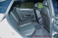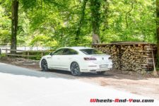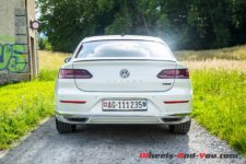 A l’arrière, l’originalité est moindre. Les feux allongés structurent la poupe, tout comme le hayon de coffre. Les sorties d’échappement, cerclées de chrome, se fondent parfaitement dans le bouclier. Les lignes sont peu nombreuses et minimales. Il en est de même de flanc où seules les jupes offrent du relief. On peut distinguer de cet angle la silhouette élancée de l’Arteon. Le pavillon de toit est plongeant, la ligne de ceinture haute, comme le veulent les codes esthétiques du moment.