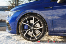 Les jantes au design ajouré laissent voir des disques de frein très bien dimensionnés avec des étriers de couleur bleue estampillés de la lettre R. Pour notre essai hivernal, la monte pneumatique adéquate est tout de même en 19 pouces. Les rétroviseurs ainsi que l’extrémité de l’aileron, les moustaches avant et le bas du pare-choc arrière sont peints en noir laqué. Un joli contraste de couleur.