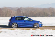 Je n’ai pas honte de dire que cette Golf 8 R offre un compromis sport/confort/plaisir de conduite surprenant auquel je ne m’attendais pas. Elle est agile, vive et parait plus légère qu’elle ne l’est. Le train avant se place exactement où la direction l’oriente et le train arrière suit sans broncher. Elle passe de virage en virage avec une belle dextérité. Parfois, le contrôle de traction et l’anti-patinage sévissent en sortie de courbe serrée, mais rien de vraiment castrateur. Elle pousse à aller faire des cols juste pour le plaisir et cela pourrait même devenir addictif même si, pour ce genre d’exercice, la voiture est un peu lourde.