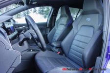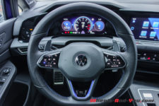 En m’installant à bord, c’est bien un intérieur typique de Golf que je découvre. Sobre, presque austère, avec par-ci par-là des notes de bleu via quelques inserts comme celui placé en bas du volant. Ce dernier est spécifique à ce modèle avec surpiqûres bleues et des palettes plus ergonomiques et surtout plus grandes. Il intègre, entres autres, un bouton « R » qui permet de directement sélectionner ce mode de conduite.