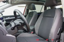 Pas moyen de se tromper, on est bien à bord d’une Golf. Un volant multifonctions gainé de cuir avec un petit rappel « Alltrack » écrit sur le bas de la branche centrale, des sièges très fermes, mais confortables sur les longs trajets, habillés du tissu «7-Summits» qui semble résistant. Je n’aime pas trop la texture des côtés des assises dans cette matière à mi-chemin entre un alcantara et un velours, mais c’est avant tout une question de goût.