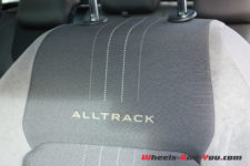 Les sièges sont estampillés du logo « Alltrack ». Les pédales sont en acier inoxydable et de jolis inserts en alu brossé « Nature Cross Brushed » égayent le bas du tableau de bord. Je trouve plein de rangements, de quoi poser mon gobelet et charger mon téléphone. Les connectiques ne sont pas en reste et, en option, une prise 230V est disponible, logée à droite dans le coffre.