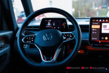 Volkswagen est connu pour ses intérieurs plutôt austères et je ne m’attendais pas à trouver quelque chose de révolutionnaire, à l’instar de l’intérieur du concept car. C’est dommage car je pense que les clients de ce genre de véhicules attendent quelque chose de plus original. La seule chose conservée du concept très futuriste présenté il y a 8 ans, ce sont les logos Pause et Play sur les pédales de frein et d’accélérateur.