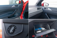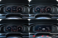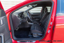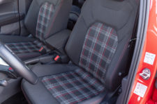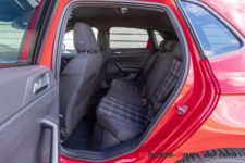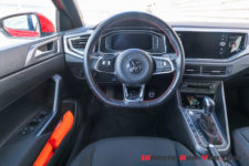 Si l’espace intérieur gagne en volume, le style reste très VW avec l’austérité qui le caractérise. Dommage pour une auto qui cherche à séduire les jeunes et les urbains. On retrouve des sièges sport en tissu quadrillé qui rappellent ceux de la première Golf GTI. La planche de bord est moderne mais tout sauf gaie. Aucune couleur si ce n’est un rappel de rouge dans le compteur de vitesse et le compte-tours. Ces derniers sont analogiques mais générés par affichage sur un écran. Ils sont séparés par une zone qui permet d’afficher soit la carte du GPS, soit diverses informations sur la voiture et ses assistances de conduite.