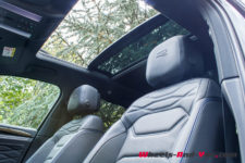 Les matériaux, sans être vraiment luxueux, sont de qualité et les assemblages sont parfait. Néanmoins, à part le cuir surpiqué, le passepoil bleu et quelques effets de capitonnage, l’ensemble est assez triste. L’éclairage multicolore réhausse le ton et, à défaut de gaité, amène un peu de clarté. Heureusement, la journée, le grand toit ouvrant panoramique illumine l’intérieur.