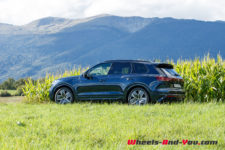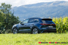 Batterie chargée à 100%, je démarre en mode électrique. Le silence de fonctionnement est impressionnant d’autant qu’en option, les vitres plus épaisses vous isolent du monde extérieur. J’opte ensuite pour un roulage hybride avec rechargement de la batterie dès que son niveau de charge affiche 50%. Ainsi, le moteur thermique ne se met en route qu’à pleine charge. Silencieux et discret, le V6 est un régal et aime tourner autour des 2’000 t/min. A 80 km/h, il ronronne à 1’200 t/min, juste au-dessus du ralenti. Pas besoin d’aller dans les tours car dès les bas régimes, les 700 Nm de couple répondent présent. Associé à une boite extrêmement douce, je me laisse bercer par les suspensions pneumatiques qui gomment tout. De la grosse bosse aux trous, on ne sent rien. Le Touareg R avale la route et évolue avec volupté.