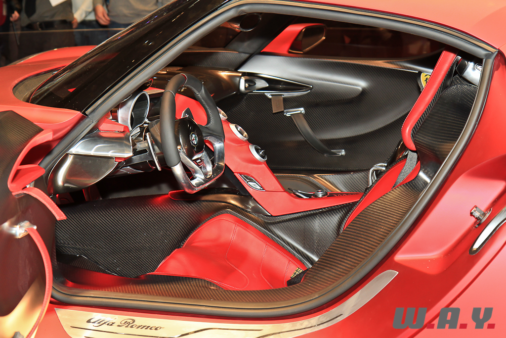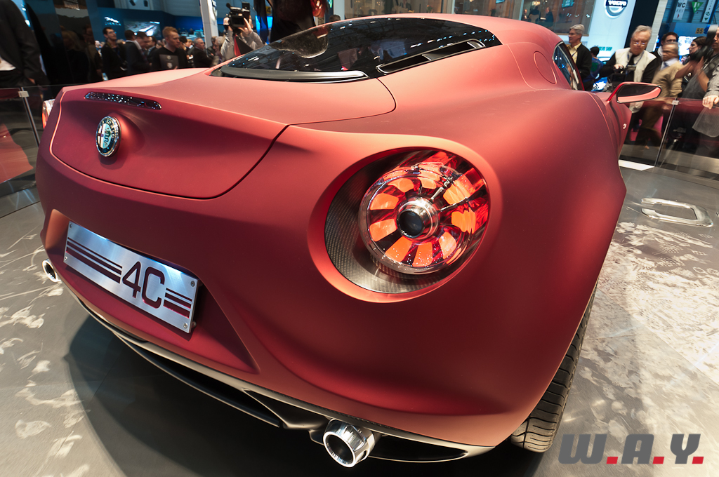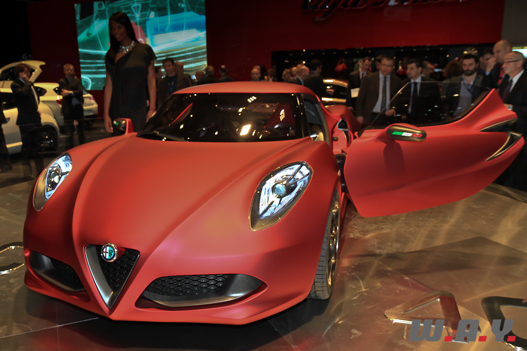 Au levé du voile, le coup de crayon semble moins réussi que pour sa grande sœur. Il faut avouer que la barre était placée haut ! Côté mécanique, ce coupé 2 places bénéficie tout de même d’attributs intéressants ! Le moteur 1.8 l. turbo à injection directe est accouplé à une boîte à double embrayage, et le sélecteur D.N.A. qui permet d’ajuster les qualités dynamiques du bolide est lui aussi de la partie. Les premières informations donnent un rapport poids/puissance inférieur à 4 kg/ch grâce à l’utilisation abondante de carbone. Le châssis dispose d’une cellule centrale en carbone et d’une crash box en aluminium, ce qui permettrait à l’auto de ne peser que 850 kg ! Le moteur développant plus de 200 cv est installé en position centrale, transmettant sa puissance aux roues arrières. Le 0 à 100 km/h est annoncé en-dessous des 5 secondes. Les qualités dynamiques ne sont pas en reste grâce à l’expérience de la 8C; la petite sportive adopte des trains roulants spécifiques qui lui permettraient de distiller un plaisir de conduire hors du commun. La dernière bonne nouvelle est que nous pourrons certainement vérifier si toutes ces promesses auront bien été tenues car l’Alfa Romeo 4C sera produite dès l’année prochaine pour un prix qui n’a pas encore été divulgué.