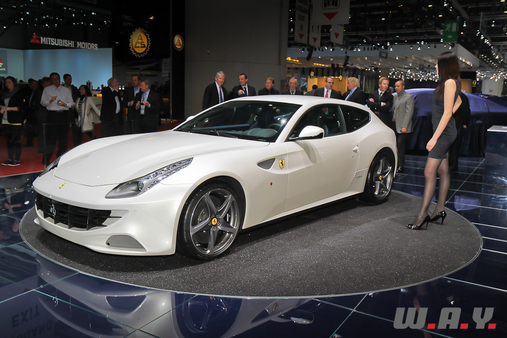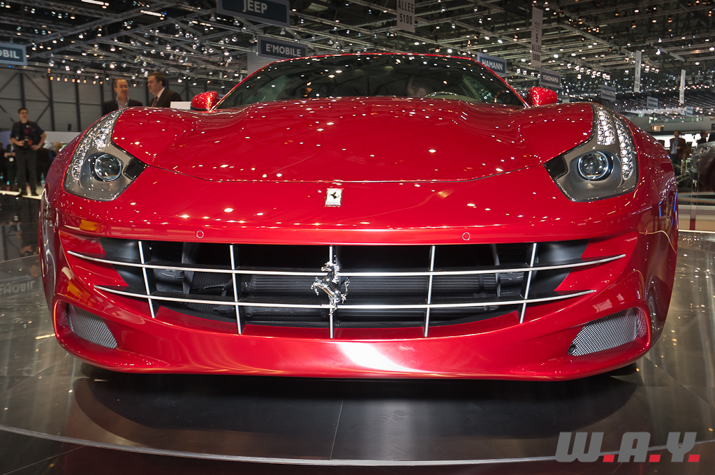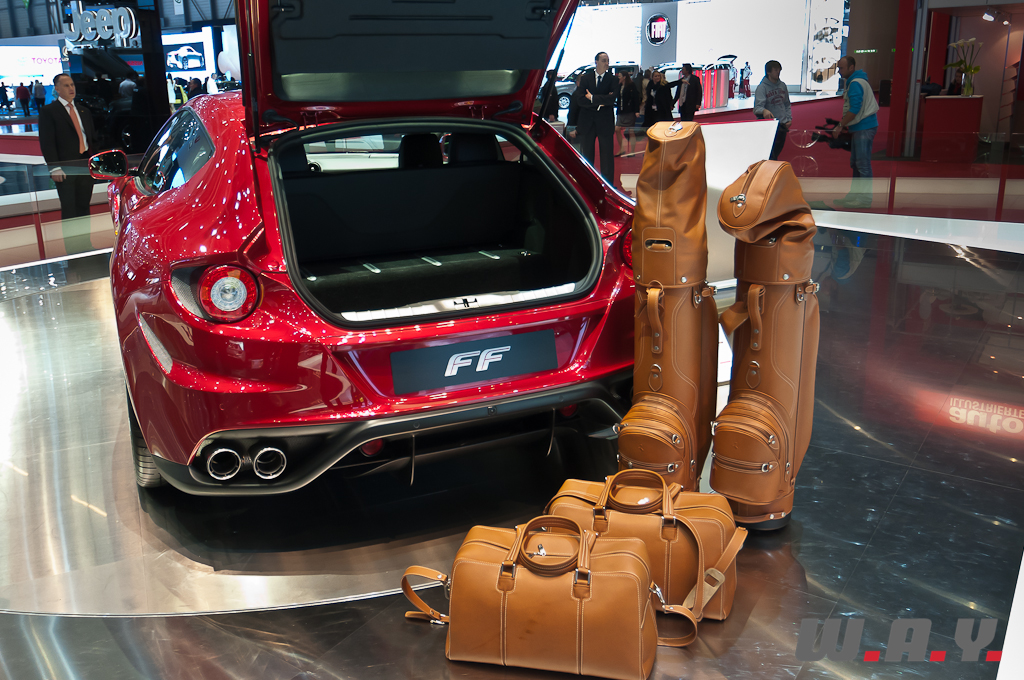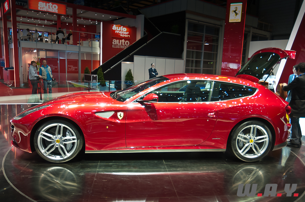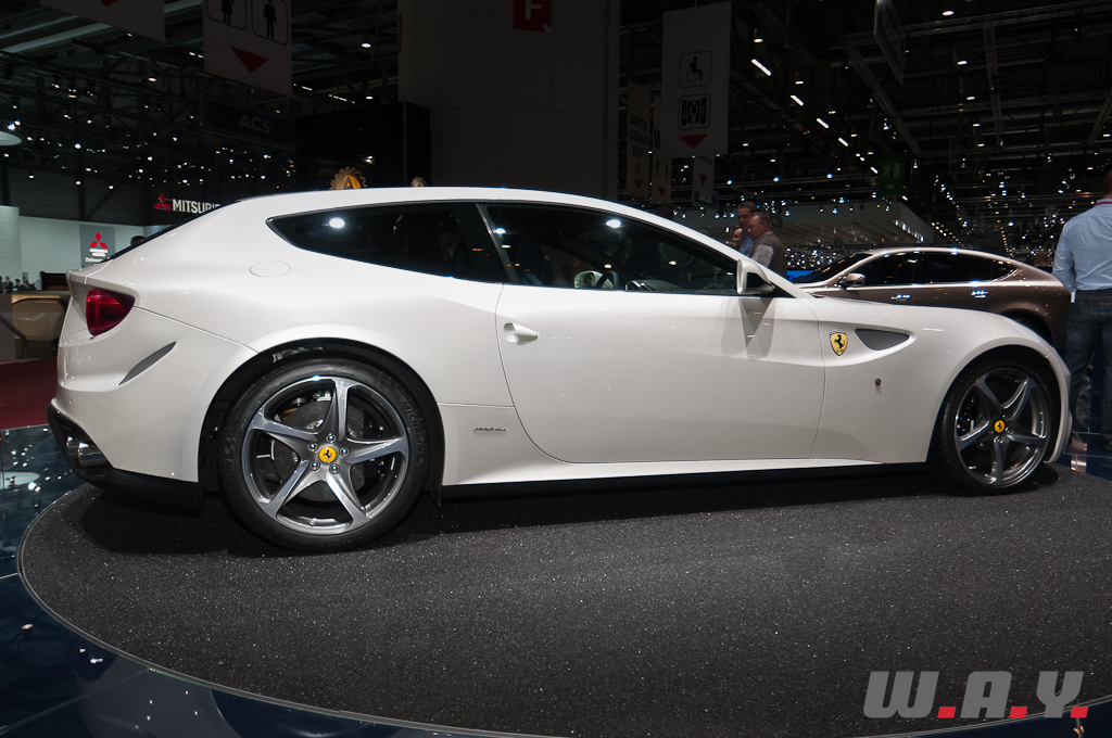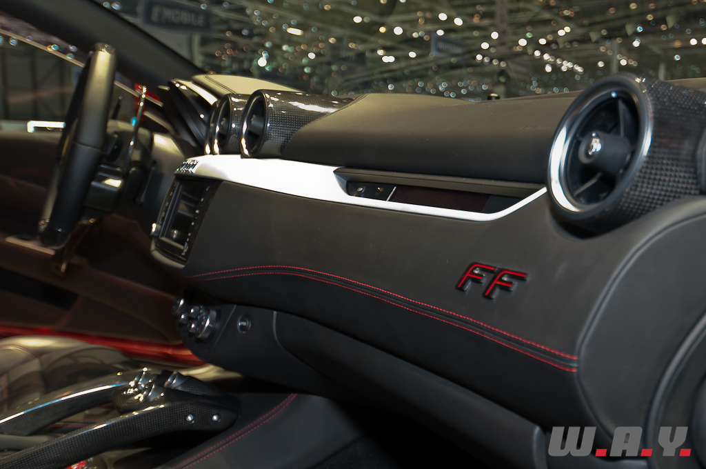 Nous avions déjà découvert la Ferrari FF suite à la présentation aux clients privilégiés de la marque et dans les différents communiqués de presse. Au Salon de Genève c’est l’occasion pour nous de l’observer sous tous ses angles et même s’installer à bord. Pas de doute, en trois dimensions, elle est encore plus belle que sur les photos. Pour rappel, cette nouvelle Ferrari est motorisée par un V12 6.3 qui développe 660 CV pour un couple 683 Nm (dont 500 Nm disponibles dès 1000 t/min) et couplé à une boite à double embrayage 7 rapports. Le 0-100 km/h est avalé en 3.7 secondes et la vitesse de pointe est de 335 km/h. Mais il n’y a pas que les performances pures qui ont été améliorées : Ferrari a aussi travaillé sur la consommation, 15.4 l/100 km, et sur les émissions de CO2, 360 g/km. C’est 25% de moins par rapport au précédent V12 de Maranello. Le système quatre roues motrices développé par Ferrari fournit le couple sur les roues arrières prioritairement et c’est ensuite l’électronique qui gère la répartition sur les quatre roues en fonction des conditions d’adhérence. Le coffre a une contenance de 450 litres qui peut être augmentée à 800 litres en rabattant les sièges arrières. L’habitabilité pour les passagers fait d’énormes progrès : les grands gabarits peuvent prendre place aisément dans les fauteuils profonds et parcourir de longs parcours ne devrait plus s’apparenter à un supplice pour les genoux. Dernier détail qui a son importance, le prix de cette nouvelle Ferrari FF débute à CHF 360’000.- et selon notre contact à l’agence Ferrari/Maserati de Genève, Modena Cars, les ventes démarrent sur les chapeaux de roue dans notre pays.