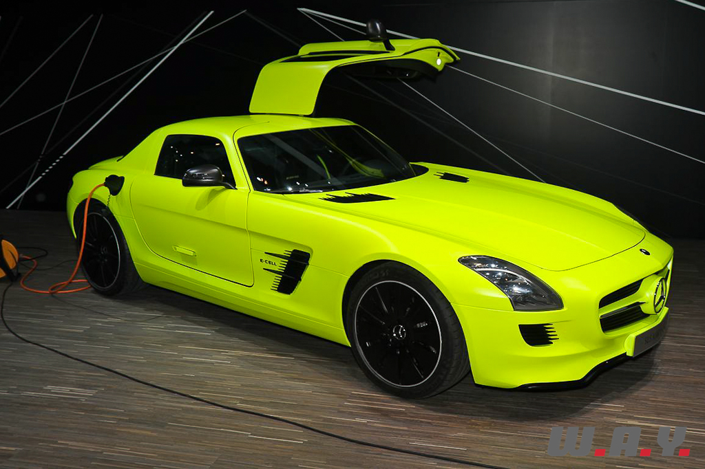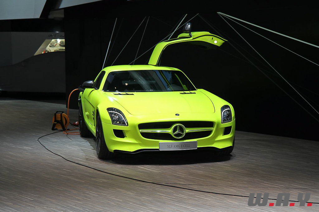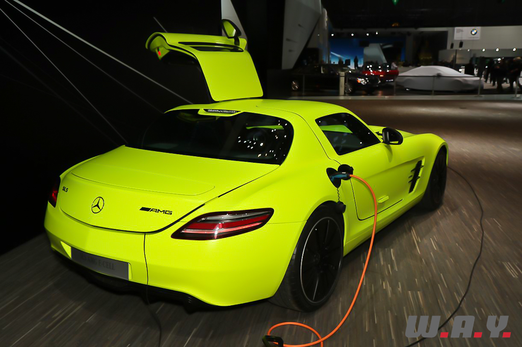 Pour égayer l’habituel “gris” qui envahit le stand Mercedes, le constructeur allemand nous présente au centre de son espace, la SLS AMG E-CELL dans une teinte jaune/vert fluo.