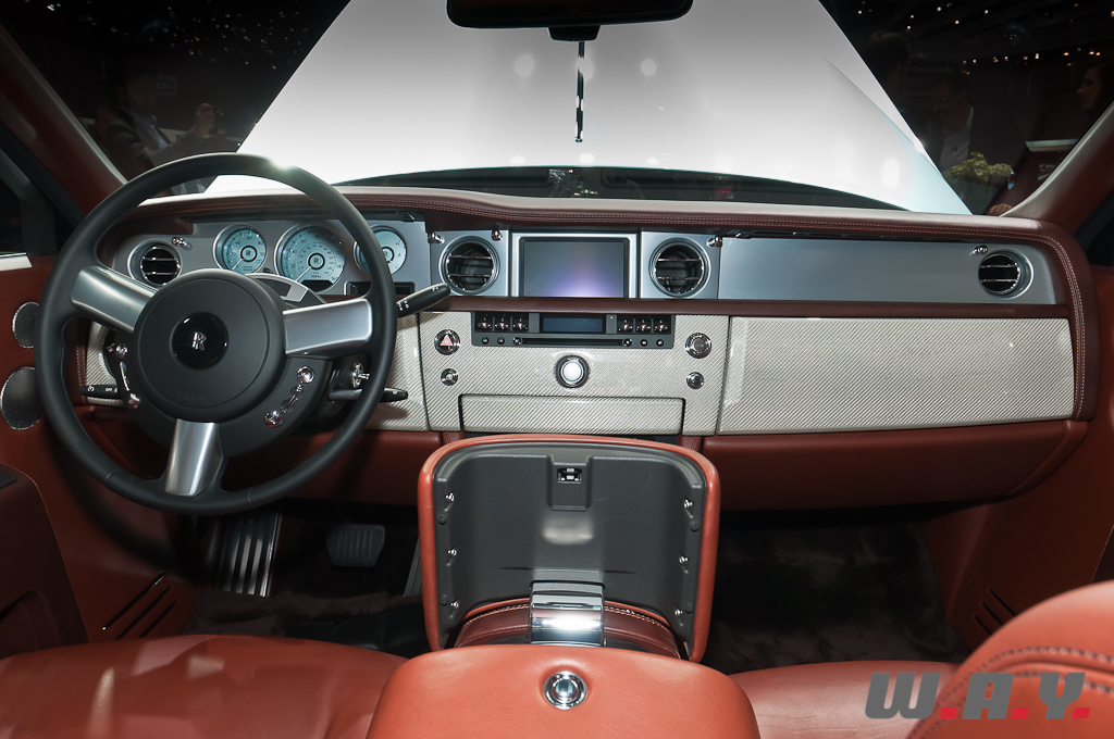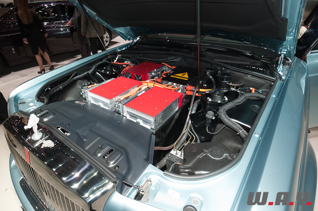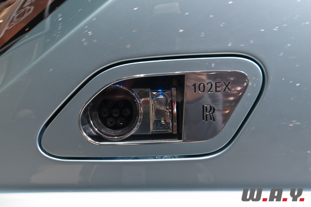Cette Phantom Experimental Electric a troqué son imposant V12 6.75 l pour des batteries lithium-ion et deux moteurs électriques, de chacun 145 kW, couplés à une boîte de vitesses composée d’un seul rapport avec un différentiel intégré. Si la puissance est légèrement inférieure à celle d’une Phantom “normale”, le couple de cette 102EX est de 800 Nm, c’est à dire 80 Nm de plus. Le fameux “Spirit of Ecstasy” est fabriqué en polycarbonate Makrolon, au lieu de l’acier inoxydable, avec à l’intérieur des LED bleues qui s’illuminent pour évoquer la motorisation électrique de cette 102EX.