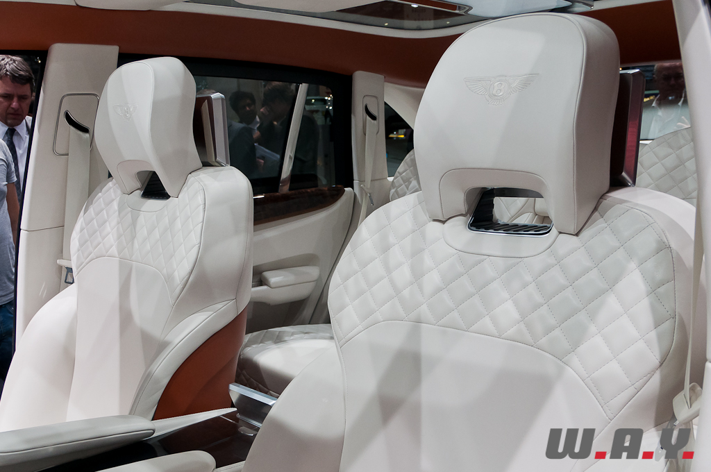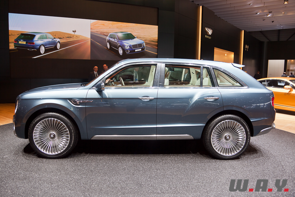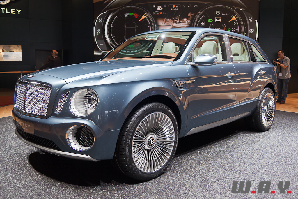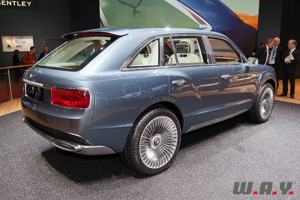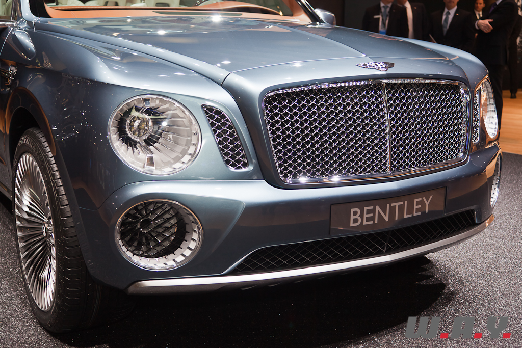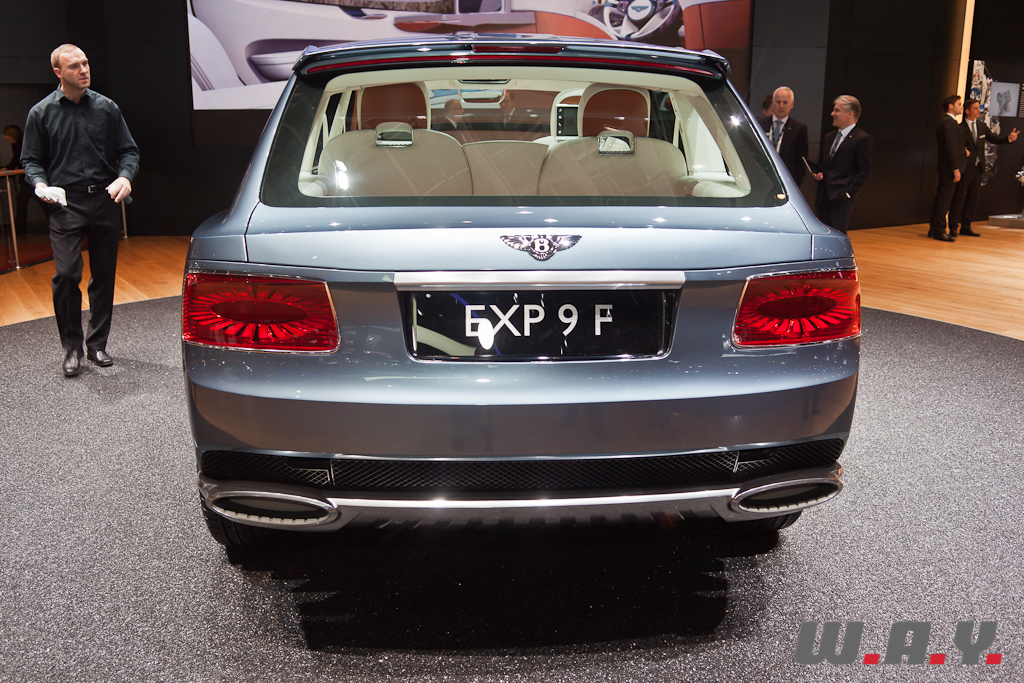 Le concept EXP 9F offre une possible troisième gamme Bentley aux côtés des Mulsanne et Continental. Il est présenté à Genève avec une motorisation W12 6,0 litres à double turbo-compression couplée à une transmission 8 vitesses. Le V8 4,0 litres à double turbo-compression lancé récemment sur la Continental GT, et dont la déclinaison GTC se dévoile aussi à Genève, voire pourquoi pas un moteur à transmission hybride, pourraient aussi satisfaire les exigences de performance de ce futur SUV. Les principales touches esthétiques propres à Bentley, telles que sa calandre, ses phares ronds, ainsi que sa ligne de puissance et ses hanches musclées sont réinterprétées pour l’EXP 9F. Le style “taillé dans la masse” et une foule de détails innovants accentuent le caractère puissant et imposant de ce SUV très haut de gamme. Fusion de luxe artisanal et contemporain avec une technologie embarquée avancée, une position de conduite prédominante et une capacité tout-terrain, dont la base provient de l’Audi Q7, tout cela fait que ce SUV pourrait bien voir le jour prochainement.