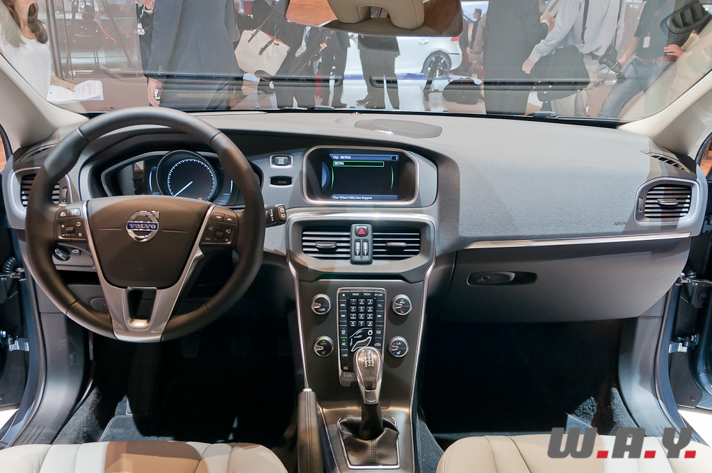 D’apparence très affûtée, cette Volvo V40 ne ressemble finalement pas vraiment à un break dans le sens basique du terme. Toutefois elle est affiliée à cette catégorie de voiture simplement par la lettre de son modèle, “V”, utilisée par la marque pour ce segment. A nos yeux, elle se positionne plutôt comme une concurrente de l’Audi A3 Sportback ou d’autres compactes, à finition haut de gamme, en déclinaison cinq portes. Le fer de lance est bien évidemment la sécurité, avec un accent sur le confort bien sûr, tout en mettant en avant aussi le dynamisme. En effet, de série, toutes les déclinaisons de la V40 seront équipés d’un châssis Dynamique qui combiné avec un centre de gravité relativement bas promet un comportement routier exemplaire. En plus, il sera possible de prendre en option un châssis Sport, abaissant la voiture de 10 mm et proposant un tarage plus ferme de la suspension. Le conducteur a aussi la possibilité de choisir le niveau d’assistance de la direction sur trois modes allant de “Low” pour les manœuvres à “High” pour une conduite très dynamique. Une multitude de motorisations sont proposées dès le lancement avec aux extrémités un petit 1.6 diesel de 115 CV d’un côté et le fameux T5 de l’autre, moteur essence turbo-compressé qui développe 254 CV. Après l’évolution esthétique extérieure, le modèle voit aussi son équipement intérieur totalement revu et à la pointe de la technologie avec un ensemble d’instrumentation entièrement graphique à affichage cristaux liquides LCD-TFT. Au centre du tableau de bord se trouve aussi un écran présentant au conducteur toutes les informations nécessaires, via l’interface Volvo Sensus et pouvant être piloté entre autre depuis le volant. Précisons encore que cette nouvelle V40 propose une armada d’assistances à la conduite accentuant ainsi le niveau de sécurité à bord comme le City Safety, que nous avions découvert à bord de la Volvo V60, désormais actif jusqu’à 50 km/h ou, pour la première fois au monde, un système d’airbag pour piéton se déployant à la base du pare-brise en cas de choc. Bref, un vrai couteau suisse cette nouvelle Volvo V40, restera à vérifier tout cela lors d’un essai complet.