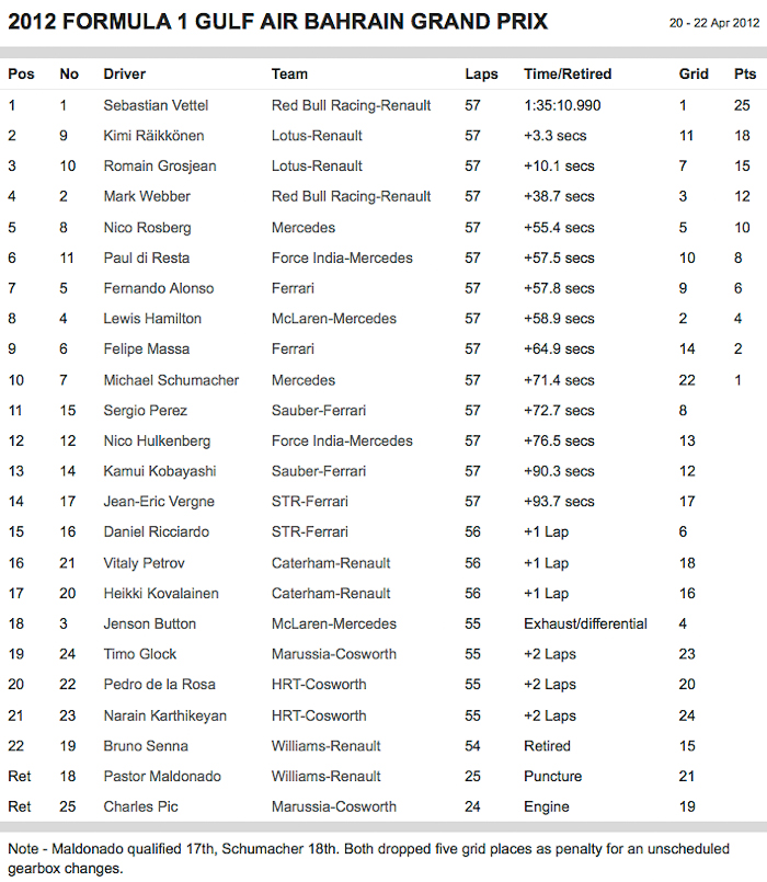 Sebastian Vettel (RedBull), parti de la Pole Position, remporte le GP de Bahreïn sur le circuit de Sakhir. Pour s’imposer il a du résister dès la mi-course au surprenant retour de la Lotus de Kimi Räikkonen. Des Lotus particulièrement efficaces sur ce tracé puisque Romain Grosjean complète le podium pour l’écurie anglaise.