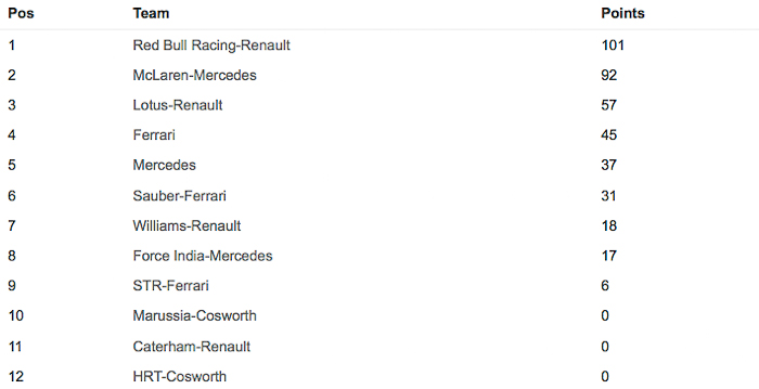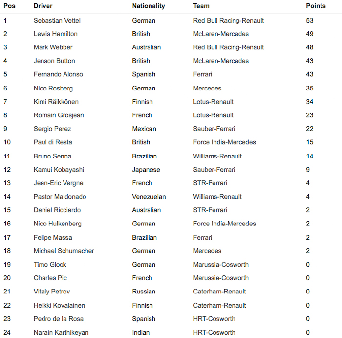 Grâce à ce retour en forme et la contre performance d’ensemble des McLaren, Sebastian Vettel prendre la tête du championnat du monde avec quatre points d’avance sur Lewis Hamilton.