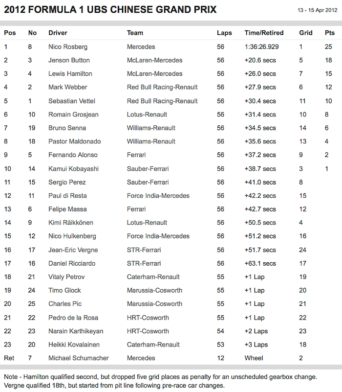 Sur le podium, au côté de Nico Rosberg, on retrouve les deux pilotes McLaren. Jenson Button finit 2ème après avoir perdu toute chance de victoire dans un interminable arrêt au stand tandis que Lewis Hamilton monte sur la 3ème marche du podium en venant à bout de Sebastian Vettel à deux tours de la fin.