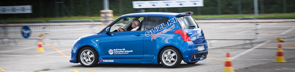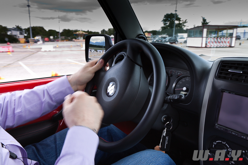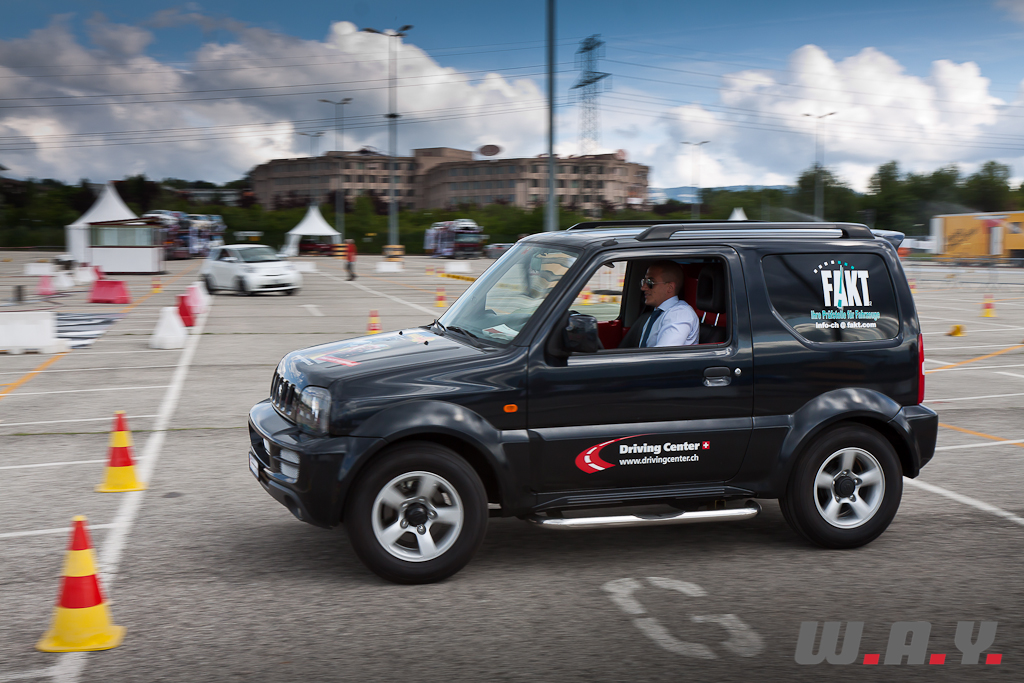 Un parcours de slalom vous permettra de comparer plusieurs voitures compactes allant de la Mitsubishi i-MiEV totalement électrique à la puissante Mini Cooper S Works ou même une Suzuki Swift optimisée pour ce tracé et un Suzuki Jimny un peu spécial. En effet ce dernier à la particularité d’avoir les roues qui tournent à droite lorsque vous tournez le volant à gauche, totalement déconcertant mais une expérience unique et très ludique ! Finalement vous aurez aussi la possibilité de prendre le volant pour réaliser des passages en courbe et des freinages sur revêtement glissant, dont un sur une piste suffisamment longue pour atteindre plus de 60 km/h.