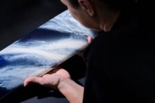 Le panneau du tableau de bord situé devant le siège arbore une représentation de ressac peinte à la main – unique à chaque véhicule – où l’écume des vagues se fond dans la couleur indigo marin. Les seuils de porte intègrent également un élément d’azur et d’écume.