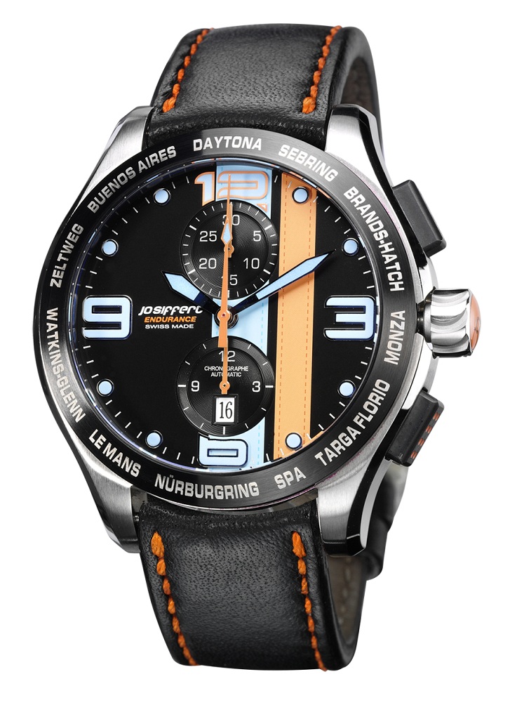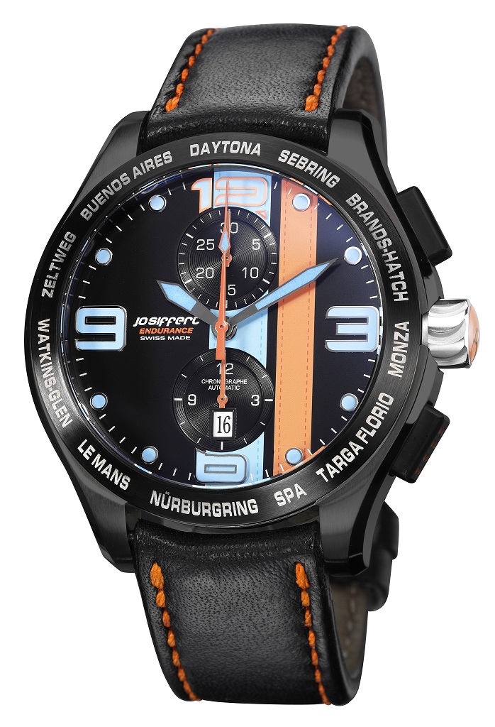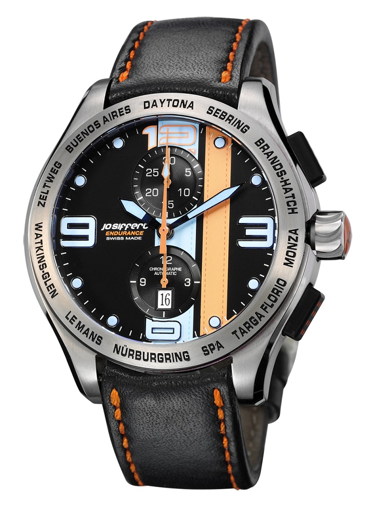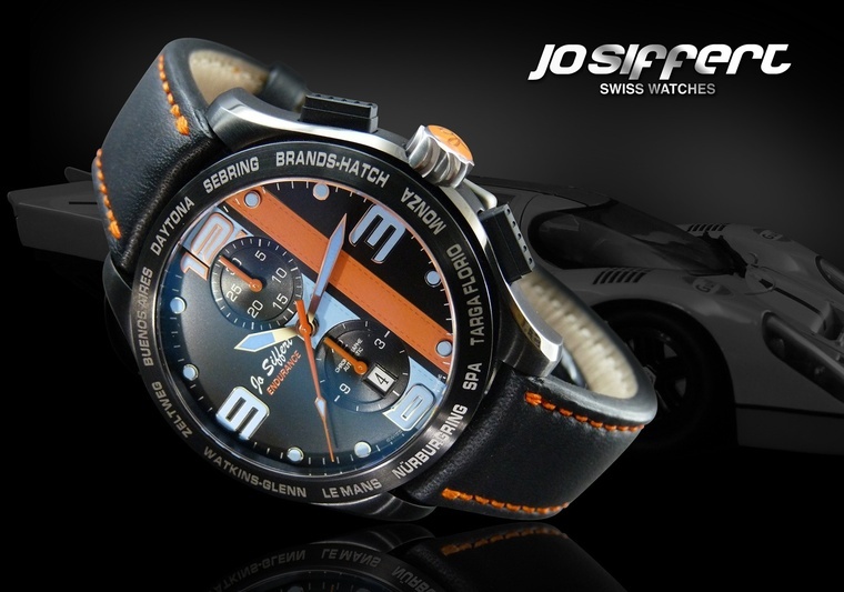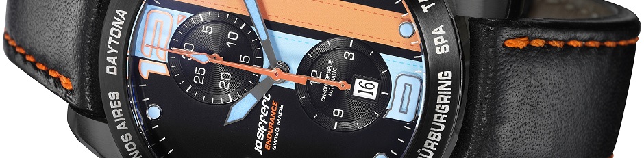 Fort des fabuleux exploits de Jo Siffert dans les courses d’endurance, son fils Philippe a décidé de concevoir une nouvelle montre qui se présente sous la forme d’un chronographe automatique au look résolument sportif, le modèle “Endurance”. Son coeur, un mouvement Valjoux 7750, est installé dans un boitier acier, normal ou noir en fonction de la version, de 44mm de diamètre. Quatre variantes sont disponibles, trois avec le cadran noir et un avec le cadran blanc, toujours avec des grands chiffres bleus et des aiguilles oranges et bleues. Dépendant du choix de la montre, la lunette est de couleur noir ou acier. Sur cette dernière, on retrouvera gravés les noms des plus prestigieux circuits synonymes de victoires pour le pilote suisse.