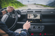 Des suspensions pneumatiques permettent d’ajuster la garde au sol et gomment trous et bosses. C’est surprenant de se retrouver dans un chemin peu carrossable et de rouler comme si j’étais spectateur. J’ai l’impression d’être dans mon salon équipé de mon casque de réalité virtuelle. Mais, la pluie redoublant, elle me rappelle à la réalité. Le Defender est un excellent “crapahuteur” et passe partout mais il faut tout de même respecter les trajectoires et garder en mémoire qu’il y a 2.5 tonnes à freiner.
