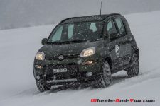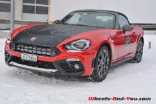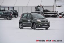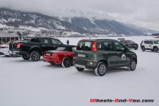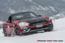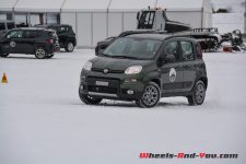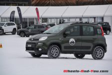 Une propulsion de 170 ch avec des pneus neige sur une piste glacée… Tout un programme ! Pour être honnête, si votre plaisir est la glisse et les dérives, ne cherchez pas plus loin, cette Abarth 124 Spider est faite pour vous. Certainement pas la plus efficace, surtout par rapport aux 4×4 présents, mais en termes de sensations, elle n’a rien d’une avare… Confortablement installé dans un intérieur couvert d’alcantara, le court levier de vitesse sportif bien en main, vous n’avez plus qu’une envie : lâcher les gaz et faire des dérives. Le look, notamment la couleur bi-ton avec capot noir mat, ajoute cette touche de « regardez-moi, j’ai un jouet sympathique », et le son de l’échappement travaillé spécialement par les ingénieurs maison donne ce petit frisson qui vous remonte le long de la colonne vertébrale… Un délice ! Malgré des aides électroniques bien trop castratrices pour l’exercice, nous en sommes tous ressortis avec la « banane ». Vous aussi vous voulez en savoir plus à son sujet, pas de souci, la rédaction de Wheels And You a prévu un essai complet avec un programme très intéressant, il faudra juste un peu de patience. En attendant, nous vous proposerons de découvrir sa petite sœur badgée Fiat.