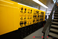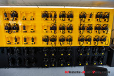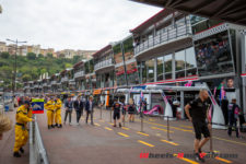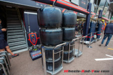 Nous nous déplaçons maintenant jusqu’à la Pitlane du circuit qui, étonnamment, ne le longe pas la ligne de départ, mais la partie opposée du circuit après la piscine. Les équipes de F1 se voient allouer chacune un garage double sur trois niveaux en construction mobile. Les 60 personnes autorisées par la FIA par équipes et par courses se concentrent dans ce petit bâtiment, ce qui impose d’avoir une équipe qui travaille simultanément ailleurs.
