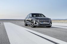 Au programme, pas moins de trois moteurs électriques qui totalisent une puissance de 503 ch et un couple de 973 Nm pour catapulter la voiture en 4.5 secondes de 0 à 100 km/h (vitesse maxi 210 km/h). Alors que tout le monde propose un ou deux moteurs électriques, Audi innove (ou exagère) en plaçant deux moteurs sur l’essieu arrière et un sur l’avant. Avec cette architecture, le constructeur annonce une vectorisation électrique avec répartition active et variable du couple sur l’essieu arrière ce qui, d’après le communiqué de presse, apportera des performances inédites. A noter que quand le véhicule roule normalement, seuls les moteurs arrières sont actifs. Enfin, côté batteries le modèle S50 offre une réserve de 71 kWh (95 kWh pour la S55) ce qui devrait permettre de parcourir environ 350 km (450 km pour la S55) en cycle WLTP.