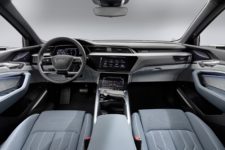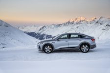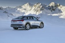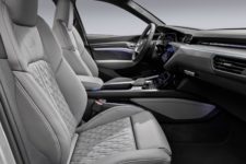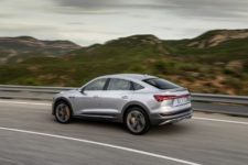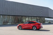 Contrairement au modèle ainé, le modèle Sportback adopte une ligne Coupé, avec un trait de ceinture oblique plus haute, relevé sur l’arrière. Le pavillon de toit est quant à lui plongeant. Si le regard des projecteurs avant est très similaire à l’e-tron 55 Quattro, le système embarqué est plus technologique : pour la première fois sur une voiture de série, les feux sont dotés de matrices digitales LED, qui fragmentent les émetteurs lumineux en pixels, pour une précision d’éclairage accrues.