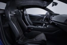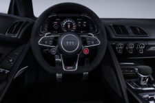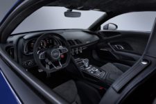 Soyons francs, les évolutions extérieurs tiennent plus d’un léger restylage que d’une refonte totale. Quoiqu’il en soit la patrie inférieure de la face avant s’inspire très largement de la nouvelle R8 LMS GT3 présentée en première mondiale au dernier Mondial de Paris. Ce nouveau design, accompagné par de nouvelle grilles à l’arrière donne un surplus d’agressivité à la R8.